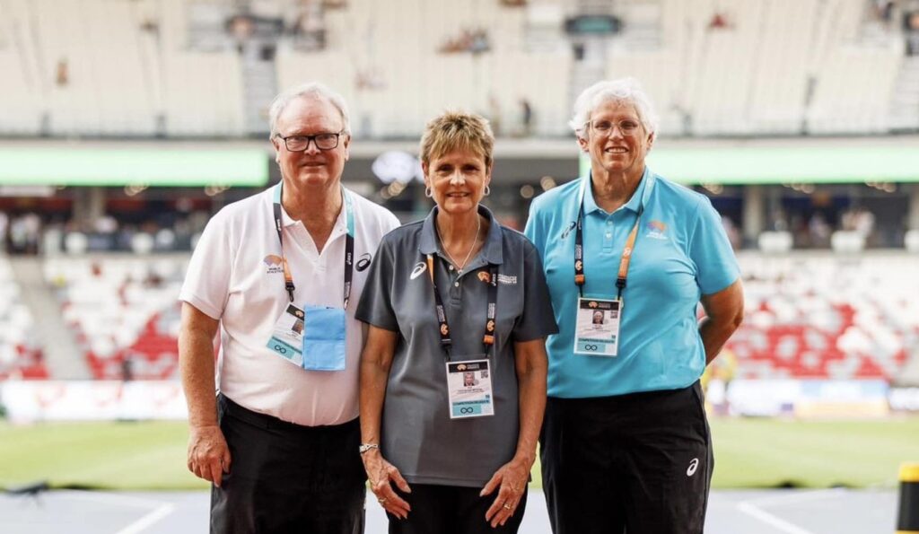 Zoe Eastwood-Bryan (centre) along with International Technical Officials Brian Roe and Helen Roberts at the World Athletics Championships in Budapest in 2023.