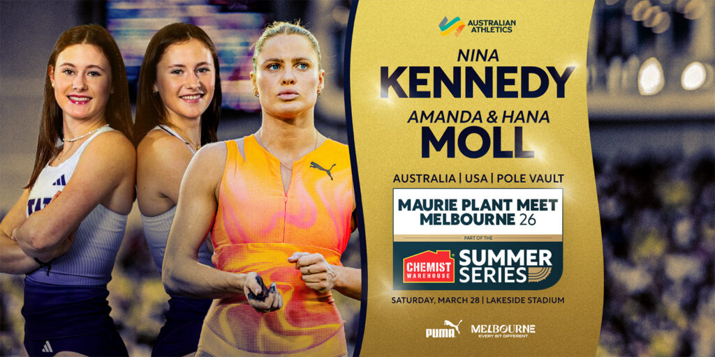 Olympic gold medallist Nina Kennedy is ready to rise to the occasion of her first Maurie Plant Meet – Melbourne, where the pole vault champion will take flight on Australia’s biggest stage against twin sensations Amanda Moll and Hana Moll from the United States.