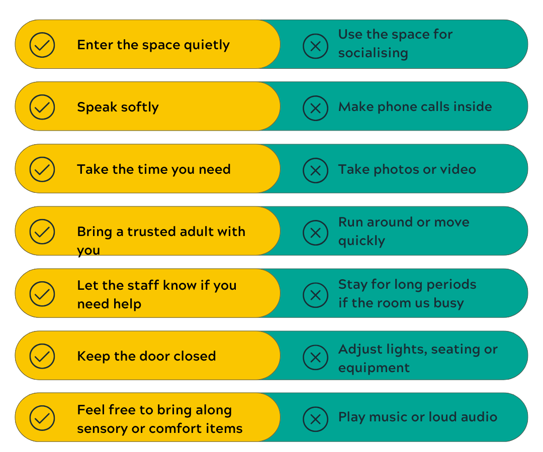 When using the Quiet Room, we simply ask that people help keep it peaceful by speaking softly, moving calmly and respecting the comfort of others.